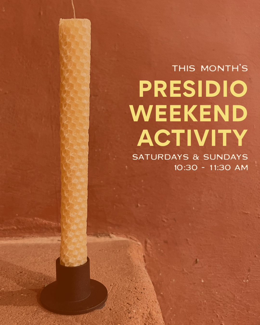 Join us for January's Presidio Weekend Activity and learn how to roll your own tapered beeswax candle! Complimentary candleholders are also available while supplies last. All materials provided, and all ages are welcome!